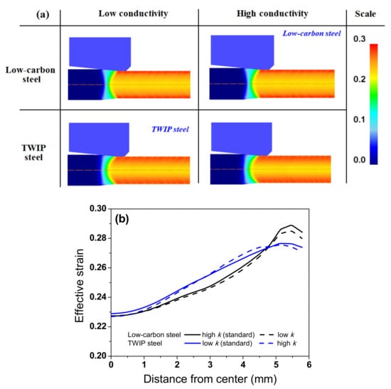 Comparison of effective strain (a) contours and (b) profiles along the radial direction of low-carbon and TWIP steels with different thermal conductivity.