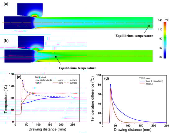 Comparison of temperature contour of TWIP steel with (a) standard and (b) high thermal conductivities. Comparison of (c) temperature profiles along the drawing direction at core and surface regions and (d) temperature difference between core and surface regions of TWIP steel.