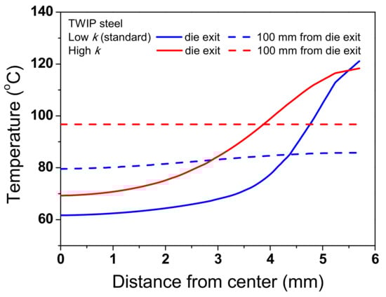 Comparison of temperature profiles along the radial direction of TWIP steel at die exit and 100 mm from die exit with different thermal conductivities.