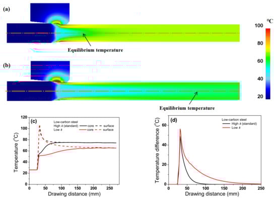 Comparison of temperature contour of low-carbon steel with (a) standard and (b) low thermal conductivities. Comparison of (c) temperature profiles along the drawing direction at core and surface regions and (d) temperature difference between core and surface regions of low-carbon steel.