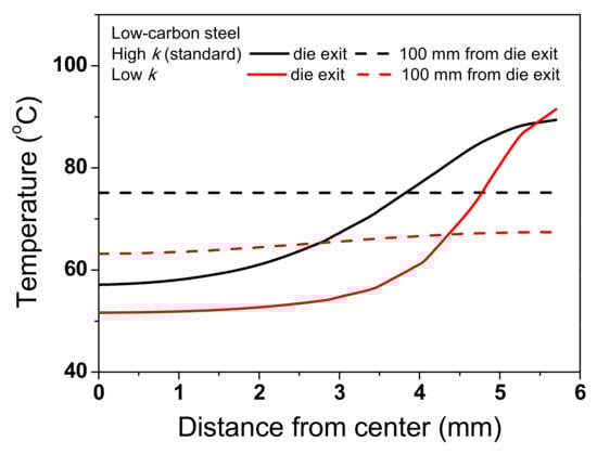 Comparison of temperature profiles along the radial direction of low-carbon steel at die exit and 100 mm from die exit with different thermal conductivities.