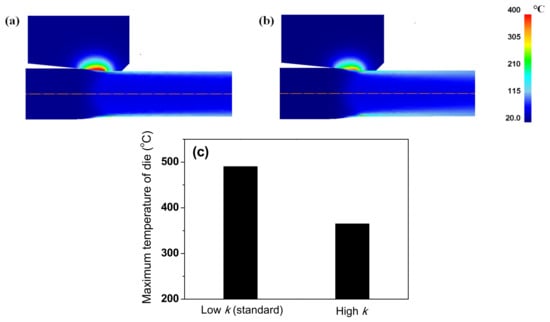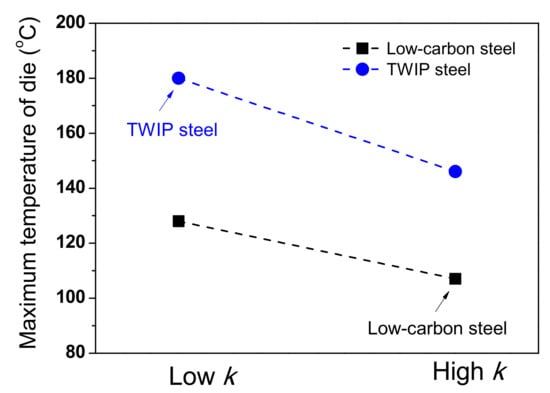 During wire drawing, die wear is strongly related to the temperature distribution of the die []. Therefore, analyzing the die temperature with the k value of a metal is necessary. Figure 15 summarizes the maximum temperature of the die for low-carbon and TWIP steels with different k values. The maximum temperature of the die increased with decreasing k of the wire, indicating that die wear can increase with decreasing the k of the wire. Figure 16 shows the comparison of temperature contour of TWIP steel with klow and khigh at the drawing speed of 0.7 mm/s to simulate the working conditions in a real plant. Both the wire and die temperatures increased with decreasing k of the wire, leading to an increase in die wear. The die temperature increased with decreasing k of the wire because the heat from the frictional heating effect between the wire and die was easily transferred to the die rather than the wire owing to the low k of the wire. Therefore, it is necessary to reduce the drawing speed as the k of the wire decreases. For example, the drawing speed should be decreased in TWIP steels compared with plain carbon steels. Based on the experiences of the author, the die wear was much higher in TWIP steel than in plain carbon steels during wire drawing. It should be noted that the die temperature in real plants was less than 300 °C owing to the cooling process in both the die and wire. Meanwhile, further study regarding the effect of thermal properties of a die on the wire drawing behaviors is necessary.