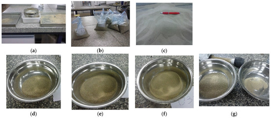 Preparation of the tested sand sample: (a) particles larger than 1.25 mm sieve removed; (b) bags classified with each particle size fraction; (c) final sample of sand tested after mixing the proper amount of the corresponding sieves; (d) 0.63 mm sieve; (e) 0.4 mm sieve; (f) 0.32 mm sieve; (g) 0.16 mm and 0.08 mm sieves.