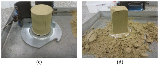 Proctor compaction procedure: (a) uniform mixing of the sample for the corresponding water content; (b) compacted specimen in an automatic compactor; (c) demolding of the compacted specimen; (d) cutting the specimen to obtain a representative sample to obtain the moisture content.
