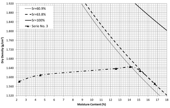 In Figure 4, different degrees of saturation of the tested sand are depicted from the compaction curve of series No. 3, from which the wet side of the compaction curve was also obtained. The degree of saturation for the optimum water content–maximum dry density is equal to 60.9%, very close to the value of 60.4% obtained from the reported correlation between the optimum degree of saturation and the optimum water content published by Spagnoli and Shimobe [7]. Moreover, from the experimental results it can be observed that the compaction points corresponding to the wet side match with those corresponding to a degree of saturation about 63.8%. For comparison purposes, the zero air void curve (Av = 0) or degree of saturation equal to 100% (Sr = 100%) was also drawn.