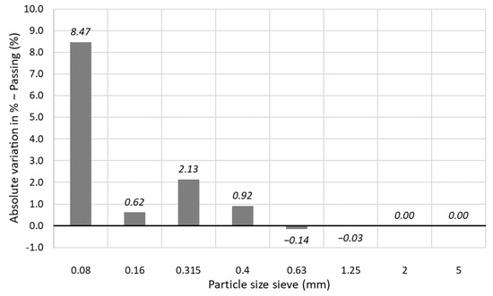 Histogram of the absolute variations for each particle size of the altered sand (after testing) in respect to the original material.