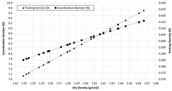 The coordination number (N) and the packing density (D) were calculated from the compaction results obtained, as shown in Figure 7. From this figure, a positive linear relationship can be outlined between coordination number (N) and dry density and between packing density (D) and dry density, since as the density increases, N and D range from N = 7.57 and D = 0.574 for the lowest dry density to N = 9.3 and D = 0.624 for the highest dry density tested, which represent an increment equal to 22% and 8.7%, respectively. This finding is consistent with the traditional approach of the compaction technique since the arrangement of the particles improves with the increment in density, resulting in more points of contact between particles. However, the highest coordination number obtained is still far from 12, which corresponds to the maximum packing density of an idealized distribution of uniform spherical particles, but very close to the dense random packing reported experimentally [18,32,33] and to the minimum void ratio estimated from Yilmaz (emin = 0.64; N = 8.9; D = 0.61) [27].