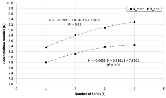Variation of the coordination number (N) at the start and at the end of each series and the corresponding adjusted trend expressions.