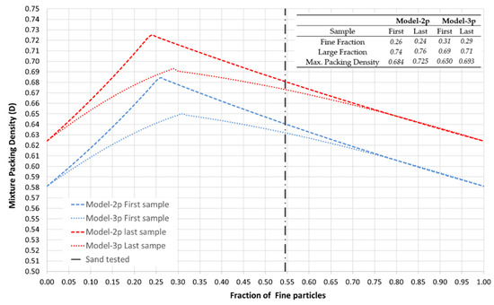 - The tested sand is also modeled as a binary mixture of spherical particles (55% fine and 45% large fractions; size ratio s = 0.324) by two-parameter and a three-parameter models that take into account the loosening, wall and wedging effects [35,36]. The theoretical optimum fractions (Model-2p: 25% fine, 75% large; Model-3p: 30% fine, 70% large) to achieve the theoretical maximum packing density for this material (up to 0.725) are far from the real composition of the sand, which presents a theoretical maximum packing density equal to 0.65 (Model-3p), asserting the lousy compaction properties of this material. After the mechanical stabilization is researched, the mixture packing density increases by up to 4.5%, matching the theoretical maximum packing density expected for the original sand.