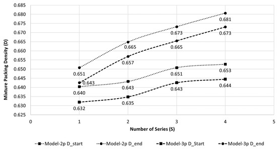 Variation of the mixture packing density (D) for each recycling and recompaction series computed for Model-2p and Model-3p [35,36].