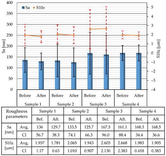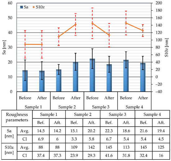 Average values of Sa and S10z surface roughness parameters determined on areas of 10 × 10 µm and corresponding confidence intervals (CI).
