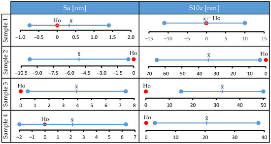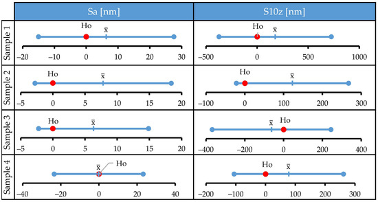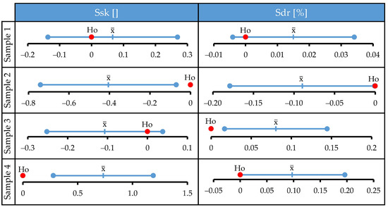 Differences in values of selected surface roughness parameters before and after the corrosion tests are negligible. Confidence intervals just slightly change after the tests, and in all investigated cases the bars of confidence intervals obtained before and after the corrosion tests overlap. This implies that the treatment did not cause statistically significant changes in tracked parameters. To confirm this, a series of paired t tests was performed, and the results are presented in Figure 3. Ho denotes the null hypothesis (mean of differences between two populations is zero), error bars denote 95% t-confidence intervals for the mean of differences, and denotes the mean of differences. The data distribution was within the normality standard. For all samples, the null hypothesis could not be rejected since Ho was within the calculated t-confidence intervals. Therefore, the t test confirmed the initial observation that the media used was unable to cause a statistically significant change of selected surface roughness parameters for large-area scans.