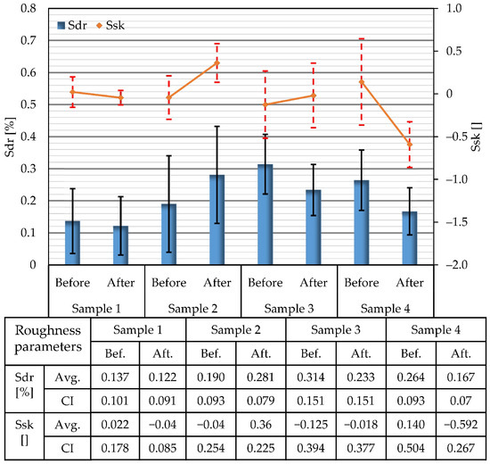 Average values of Sdr and Ssk surface roughness parameters determined on areas of 10 × 10 µm and corresponding confidence intervals (CI) of all investigated samples.