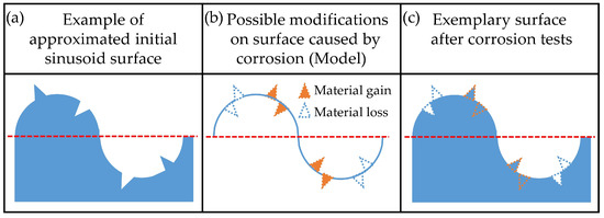 Graphical presentation of the analysis performed for detection of corrosion effects on surface topography: (a) approximated initial profile (before treatment); (b) possible corrosion effects and their locations; (c) profile of exemplary surface after corrosion.
