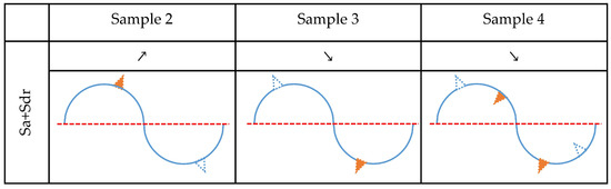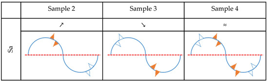 The analysis is first performed for the change in the Sa parameter, as shown in Figure 9. The increase in this parameter, which is observed for Sample 2, could be caused by material gain above and/or material loss beneath the mean plane. All other possible effects would decrease the value of Sa. They could be present but can be excluded as non-dominant. Accordingly, a decrease in Sa values for Sample 3 can be explained by material loss above and/or material gain beneath the mean plane. Sample 4 did not exhibit a detectable change in the Sa parameter, which means that in this medium all corrosion effects can be present on the surface. The profile model for this sample looks like the exemplary surface shown in Figure 8c.