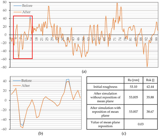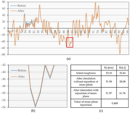 In order to depict these effects on the currently analyzed profiles, we performed simulated corrosion experiments where surface changes were known a priori. Thus, their effect on Ssk could be easily discerned. Two simulated corrosion attacks were carried out. Simulation 1 revealed the influence of the high-intensity corrosion effects, and simulation 2 revealed low-intensity corrosion effects on the change of parameter Ssk. For simplicity, the simulation of corrosion effects on the Ssk parameter is performed on a single profile taken from measurement performed before the corrosion experiment (Figure 11 and Figure 12). It is postulated that equivalent profile and surface (areal) roughness parameters have similar responses to similar topography changes. Simulation of a relatively high intensity localized corrosion attack on profile and its effect on parameters Ra and Rsk is displayed in Figure 11. The corrosion intensity is set in a way that changes on a profile cause a (relatively high) change of parameter Ra that is detected as significant in this investigation. After the simulated corrosion attack, the area above the mean plane decreased. This type of change causes the repositioning of the mean plane, downwards, relative to the unchanged part of the surface (Figure 11b). Consequently, it resulted in a decrease in the depth of the unchanged grooves and an increase in the height of the unchanged peaks. By comparing the values of the Rsk parameter of the initial profile and profile after simulated corrosion (without plane repositioning), it can be noticed that material loss caused a decrease in this parameter (Figure 11c). However, due to the repositioning of the mean plane (Figure 11c), it can be noticed that this process caused an increase in the Rsk parameter. Such changes occurred due to the fact that the unchanged peaks became higher, and the unchanged grooves became shallower.
