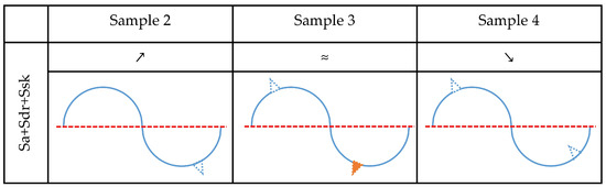 To reveal whether the corrosion process caused by specific media induces material loss, material gain, or both, it is necessary to determine the exact location of changes relative to the surface mean plane. By superimposing 3D topographic data before and after corrosion, one can calculate exact volumetric changes. Unfortunately, this kind of analysis could not be performed on the results of this study. All measured surfaces were subjected to corrosion and, therefore, one could not reliably determine the vertical axis and precisely superimpose one dataset over another. This could possibly be achieved by properly masking one part of the surface to completely preserve it and use it for matching pre- and post- corrosion measurements. This technique is not yet sufficiently refined. Therefore, in this study, we developed a methodology for assessing material gain or loss through the combined effect of various roughness parameters. The underlying logic behind the developed methodology is explained on an exemplary surface and graphically presented in Figure 8. The initial surface of the sample is approximated with a sinusoidally shaped profile with small peaks and valleys above and below the mean plane (Figure 8a). The possible effects of corrosion and the locations of their manifestation on the initial profile are schematically represented by symbols given in Figure 8b. After incorporating these transformations, a profile model is obtained. It contains all the changes that may occur on the initial profile (Figure 8c). By analyzing the formulas used to calculate them, the change in each surface roughness parameter (Sa, Sdr, Ssk) can be correlated with a specific dominant corrosion effect, i.e., material gain or loss relative to the mean profile plane. Through the elimination method, one can disqualify effects that cause opposite trends in surface roughness parameters and thus deduce a dominant effect of a specific corrosion medium (Sample) on surface topography.