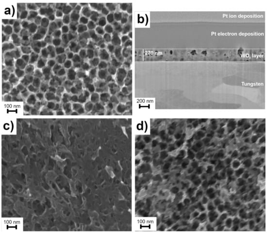 SEM micrographs of WO3 surfaces obtained using various electrolyte composition: (a) 0.1 M NaF in 1 M H2SO4, without protective layer; (b) FIB cross-section of (a) after deposition of Pt protective layer; (c) 0.1 M (NH4)2SO4 in water; and (d) 0.1 M NH4F in 1 M H2SO4.
