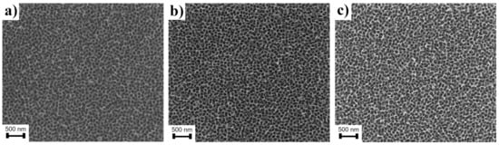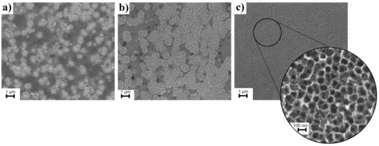 The morphology of the samples was examined using a scanning electron microscope (SEM, a FEI Nova NanoSEM 450, Brno, Czech Republic). For imaging, low-energy electron detectors, an Everhart–Thornley detector (ETD) and a through-the-lens (TLD) detector, were used in the low- and high- resolution modes, respectively. All modes were performed in the same configuration at a primary beam energy of 10 kV.