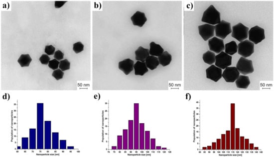 TEM micrographs of trisoctahedral gold nanoparticles of various diameters: (a) 70 nm; (b) 94 nm; and (c) 115 nm. Size distribution of nanoparticles: (d) 70 nm; (e) 94 nm; and (f) 115 nm.
