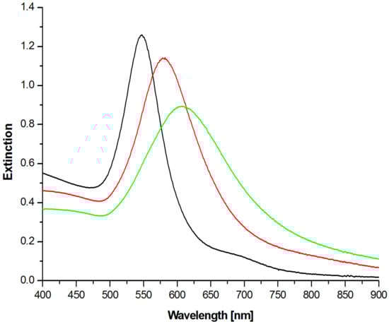 UV-Vis excitation spectra of trisoctahedral gold nanoparticles of various sizes: black—70 nm, red—94 nm, and green—115 nm.