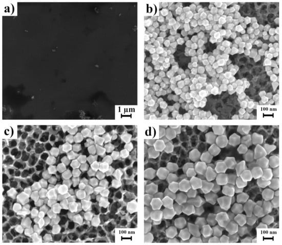 SEM micrographs showing the surface of flat WO3 covered by 94 nm trisoctahedral gold nanoparticles (a) and nanopores WO3 covered by trisoctahedral gold nanoparticles of 70 nm (b), 94 nm (c), and 115 nm (d).