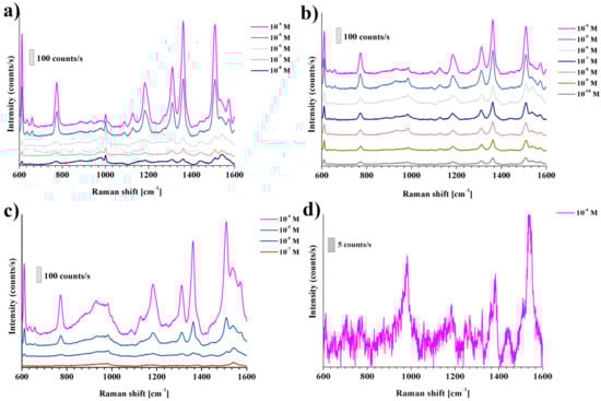 The SERS measurements were carried out after dropping 10 µL of R6G (Rhodamine 6G) solution of various concentrations in the range of 10 mM to 100 pM.