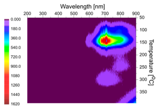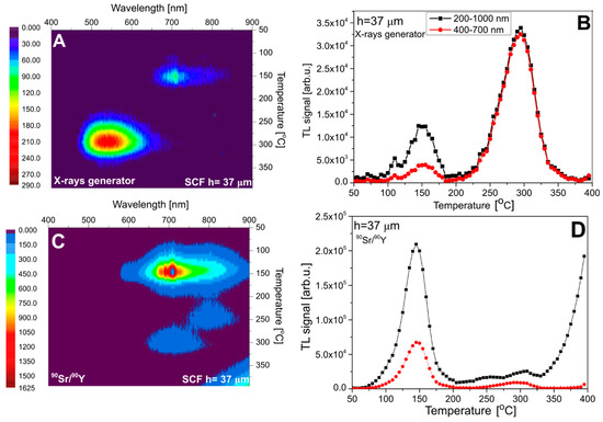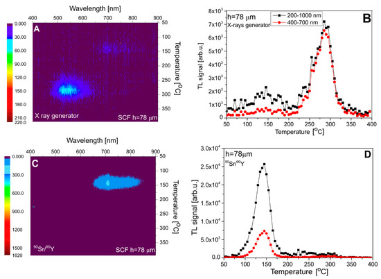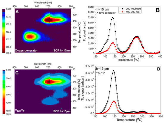| Peak Number and Origin of the TL Signal: SCF or SC | Temperature [°C] | Wavelength [nm] | ||||||