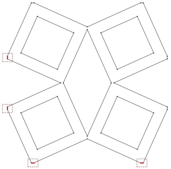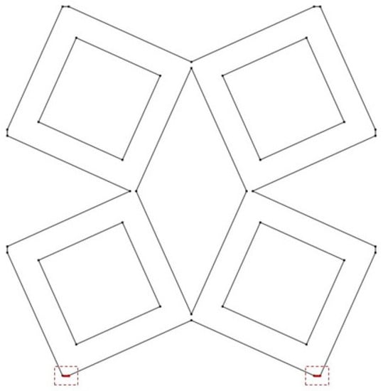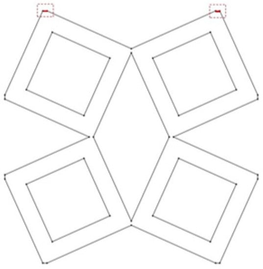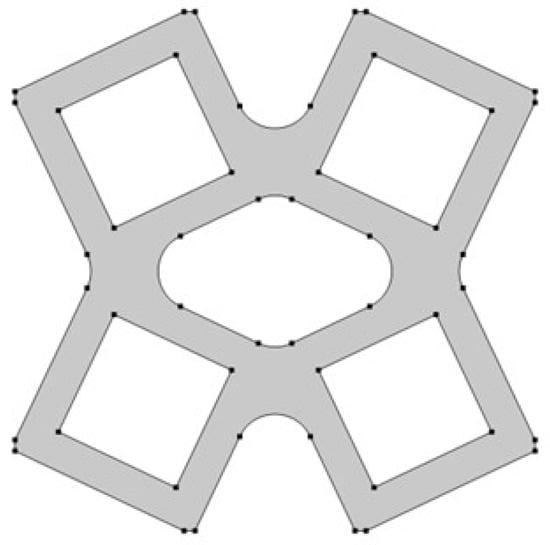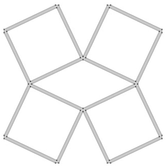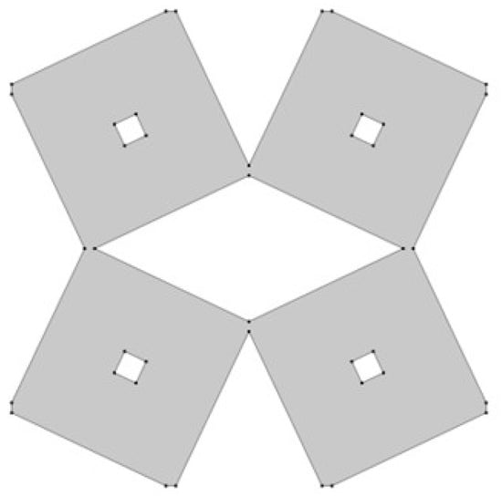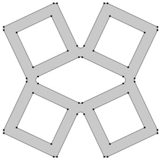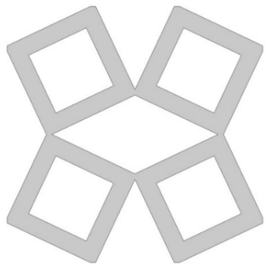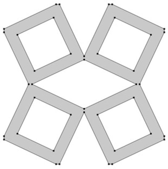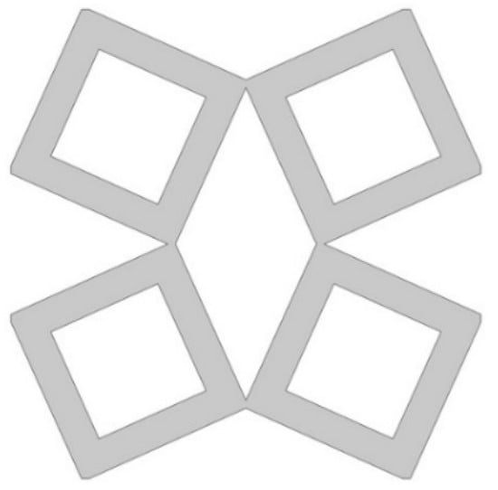 Auxetic structures with rotating units were presented by Grima and Evans [33], where rigid rectangular and triangular cells were connected together at selected vertices by hinges. The later papers on this topic of auxetics made of rotating units were published by researchers from Malta [14,34,35,36,37] and Slovenia [38]. Grima-Cornish et al. [14] described the role of rotating rigid units in generating negative thermal expansion (NTE) and negative compressibility (NC) in auxetic materials with a mechanism made of rotating units (RUM) or quasi-RUM (qRUM). Han et al. [39] investigated the influence of the hole radius in the design domain of an auxetic structure with rotating units on the mechanical properties of the structure and the importance of the materials in different parts of the design domain to the overall stability of the structure.