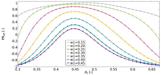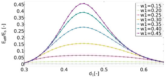 The next essential geometric feature of the structure is the distance between the outer square and the inner square (w1). The parametrized dimension is shown in Figure 5. The inner square is cut from the surface of the base shape. The w1 parameter was analyzed in the range of 0.15–0.45 (Figure 6 and Figure 7).