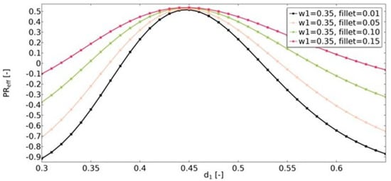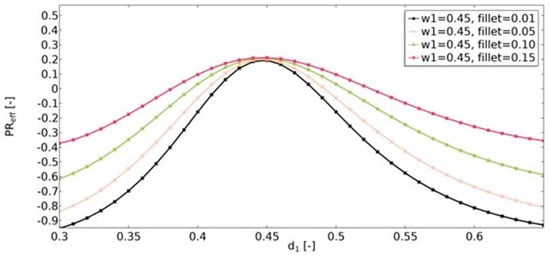 Another analyzed parameter was the fillet radius. For non-auxetic structures, the fillet radius is not considered a significant parameter affecting the obtained value of υeff. In the case of an auxetic structure, the larger the radius, the higher the value of υeff observed.