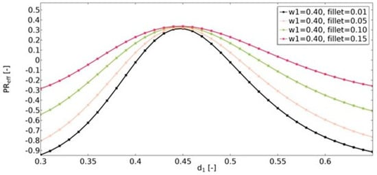 The last analyzed parameter was the radius of the fillet in the middle part of a unit cell. The parameter has a value from 0 to 0.15 (Figure 8, Figure 9 and Figure 10).