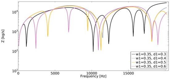 The influence of geometric features on the value of mechanical impedance in the frequency range of 1–20,200 Hz for w1 = 0.35.