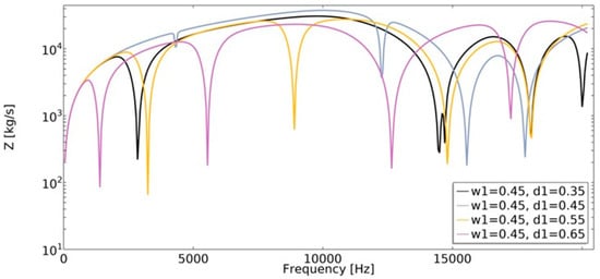 The influence of geometric features on the value of mechanical impedance in the frequency range of 1–20,200 Hz for w1 = 0.45.