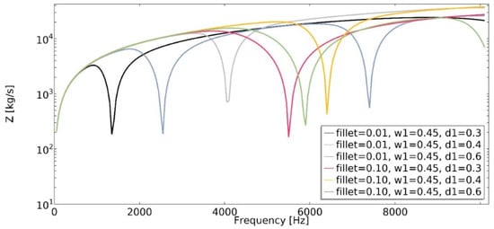 The influence of fillet radius on the value of mechanical impedance in the frequency range of 1–10,100 Hz.