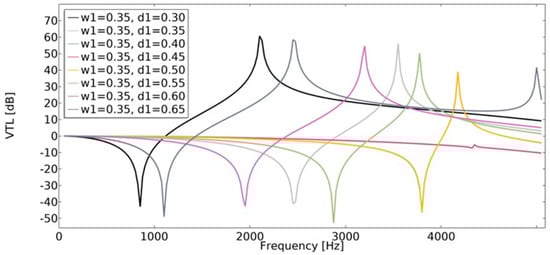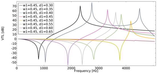 Vibration transmission loss (Equation (22)) of the structures was investigated using the finite element method. The vibration transmission loss of auxetic structures reaches a higher value than structures with a positive value of the effective Poisson’s ratio (Figure 22 and Figure 23). The lowest value of VTL was achieved in a non-auxetic structure for which the variable d1 was 0.45 (for both cases of w1). With a higher value of w1, the obtained VTL reached a more beneficial level.