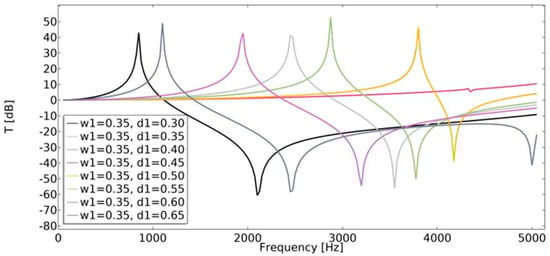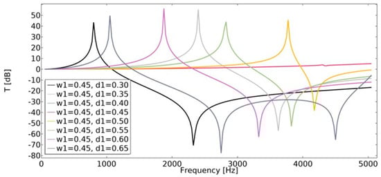 One of the obtained auxetic structures (w1 = 0.45 and d1 = 0.3) had a wider frequency gap band than other structures for frequencies in the range 1–10,000 Hz, as shown in Figure 11. Another auxetic structure (w1 = 0.35, d1 = 0.3), for the frequency above 17,000 Hz, demonstrated the most advantageous influence on the obtained dynamic characteristic. The value of mechanical impedance fluctuated in the range of 102 to 104 . For the whole analyzed range of d1 parameter, the larger the radius of the fillet, the higher the frequency value in which the local minimum is observed (Figure 21).