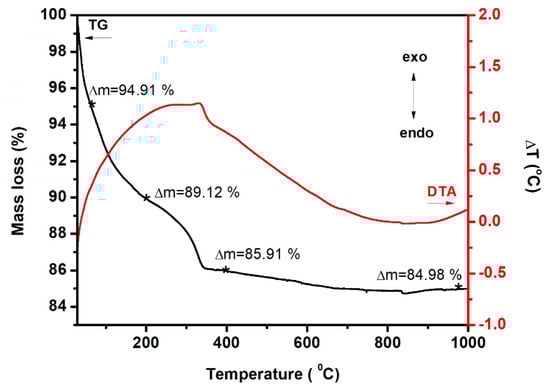A significant mass loss takes place up to 400 °C, after which no significant losses are recorded. Overall, the total mass loss at 1000 °C was 15.02% and is assigned to the drying process of the gel, in which much of the organic precursor has been removed. Prior to 900 °C, a small mass loss of 1.03% is attributed to the volatile compounds formed and remained inside the material pores. The DTA curve presents a big exothermic peak which unfolds in the 20–800 °C range confirm the two listed decomposition steps. The peak corresponding to the elimination of the organic fragments can be described by the following temperatures: Tonset = 318.35 °C, Tpeak = 331.02 °C and Tend = 352.76 °C.