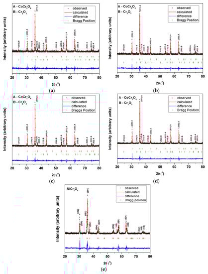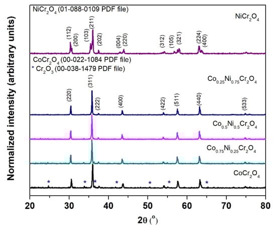 In the literature, there are studies regarding spinel oxides such as CoCr2O4, MgCr2O4, Co(1−x)MgxCr2O4 [17,18] and NiCr2O4 [19] which have been synthesized by different methods and are investigated for different applications due to their thermal stability, as previously noted.