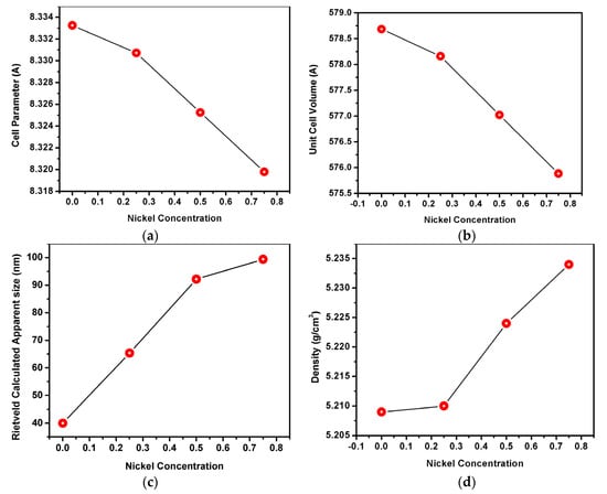 When the Ni2+ content is increased, the lattice parameter and volume unit decrease (Figure 4a,b). This decrease is assigned to the difference of ionic radius of Ni2+ and Co2+, i.e., with nickel having a smaller radius. Similarly, the density increases with the increase of nickel concentration (Figure 4d).
