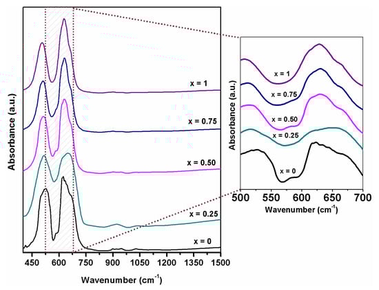 The FT–IR spectra of Co(1−x)NixCr2O4 (x = 0, 0.25, 0.5, 0.75 and 1) samples are presented in Figure 5. Two strong absorption bands centered at 516, 620 cm−1 with a shoulder at 666 cm−1 are observed. These absorption bands are the spinel characteristic peaks and depend on the vibration of the cations at the B site [25,26,27].