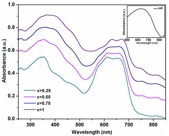 The Ni2+ substitution of Co2+ in CoCr2O4 matrix was investigated by UV-VIS spectroscopy. The optical absorption spectra of the Co(1−x)NixCr2O4 (x = 0, 0.25, 0.50, 0.75 and 1) recorded in the wavelength range from 250–850 nm are presented in Figure 7. The recorded spectra of the synthesized nanoparticles are very similar to the spectra of CoCr2O4 [29] and, also of NiCr2O4 [29] as reported in the literature. The band around 259 nm can be attributed to the charge-transfer transitions between O2− and Cr3+ [17,29].