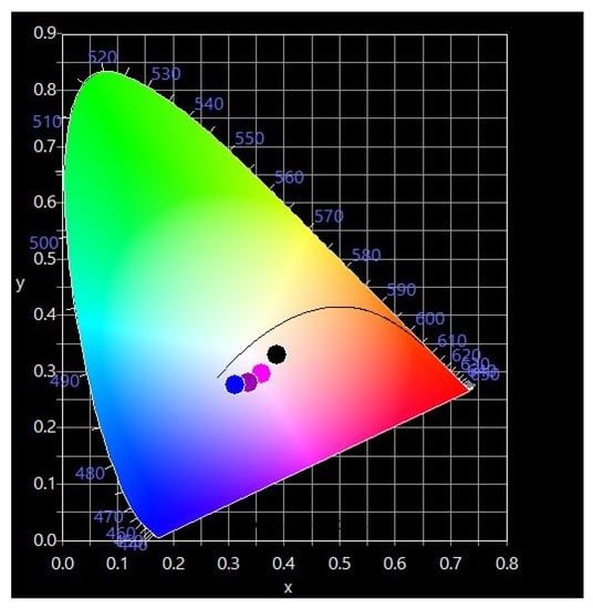 The UV-Vis data were used to determinate the CIR color coordinates, (x, y) of the pigment samples. The obtained color parameters are listed in Table 3 and represented in the CIE diagram illustrated in Figure 8. As can observed, the color coordinates slightly vary from (0.3865, 0.3295) when x = 0.25 to (0.3118, 0.2762) when x = 1 and ranging in between for x = 0.5 and 0.75. Increasing the nickel concentration in the matrix leads to a shift from a pink-turquoise to a greenish-blue color. This observation is correlated with the literature data [10] and the UV-Vis absorption spectra described previously.