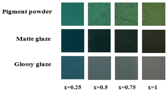 The stability of pigments was checked by incorporating them in both matte and glossy tile glaze, using a 2% pigment addition. Thermal treatment for glaze melting was performed at 1200 °C for 6 h at maximum temperature. The glazes were characterized using a color spectrophotometer spectro–guide series (BYK Gardner, Los Angeles, CA, USA).