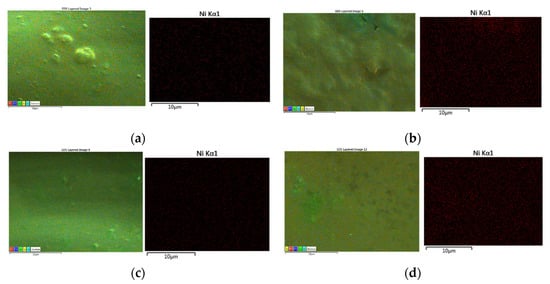 EDX element layered image including Ni Kα1 of the ceramic glossy tile cross-section as a function of nickel substitution in the chromite spinel (Co(1−x)NixCr2O4) where (a) x = 0.25, (b) x = 0.5, (c) x = 0.75 and (d) x = 1.