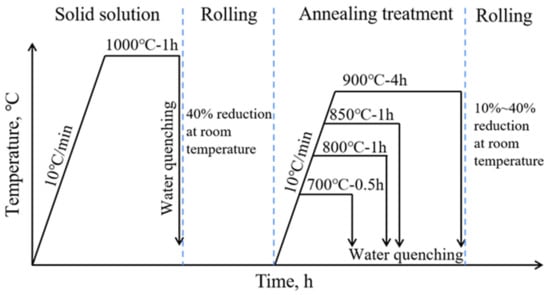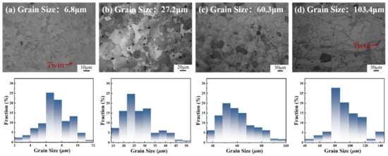 The high-manganese steel composition chosen for this experiment was Fe-18Mn-1.3Al-0.6C (wt.%). The hot rolled steel was solid solution treated at 1100 °C for 1 h, followed by water quenching to obtain single-phase austenite organization. The steel is then cut into 10 mm thick sheets using a wire-electrode cutter and cold rolled at room temperature with a total reduction of 40%. Then different annealing treatments were adopted to obtain four different recrystallized grain sizes; the annealing temperatures and times were 700 °C for 0.5 h, 800 °C for 1 h, 850 °C for 1 h, and 900 °C for 4 h. Four groups of samples with average grain sizes in the range of 5~10 μm, 10~30 μm, 50~70 μm, and 100~200 μm were obtained, as shown in Figure 1. Based on the quantified statistics from Image Pro Plus software, the average grain size was 6.8 μm after 0.5 h annealing at 700 °C, 27.2 μm after 1 h annealing at 800 °C, 60.3 μm after 1 h annealing at 850 °C, and 103.4 μm after 4 h annealing at 900 °C. In addition, few annealing twins were observed, which had little effect on the mechanical properties of the annealed samples due to the very small volume fraction. Then the samples with different grain sizes were further rolled at room temperature with a 10%, 20%, 30%, and 40% reduction, respectively. The experimental processes are shown in Figure 2.