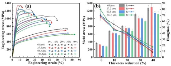 The engineering stress-strain curves of four groups of rolled samples with different grain sizes are shown in Figure 3. The curves are smooth and without waviness, and no dynamic strain aging effect occured. The tensile strengths of the four groups of rolled samples with different grain sizes increased with the amount of reduction, while the plasticity decreased. The tensile properties of the samples with different grain sizes showed different trends. The sample with an average grain size of 6.8 μm exhibited good plasticity at a lower reduction, with a tensile strength of 1324 MPa and elongation of 60%, which was the best among the four groups of samples. However, the plasticity decreased sharply with the increase in the rolling reduction, and only 13.1% elongation was achieved at a 40% reduction, which indicates a high work-hardening rate and a poor work-hardening capacity. It is worth noting that the plasticity of the sample with grain size 103.4 μm was lower than that of other three groups of samples at a low reduction, and the elongation was approximately 50%. With the increase in reduction, its plasticity decreased at a significantly slower rate compared with the other three groups of samples. The elongation was still 22% when the reduction increased to 40%.