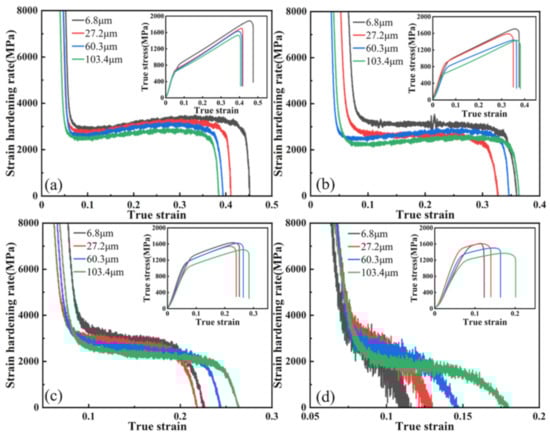 Work-hardening rate curves for each grain size sample at 30% reduction: (a) 6.8 μm; (b) 27.2 μm; (c) 60.3 μm; (d) 103.4 μm.