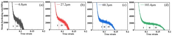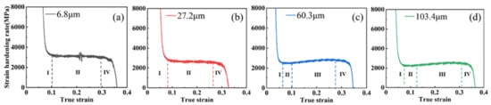 Stage Ⅱ: In this stage (0.09 << 0.15), the increase in plastic strain leads to a large multiplication of dislocations and starts to slip. In addition, the sample undergoes macroscopic deformation, at which time the work-hardening rate is reduced slowly or no longer reduced by dislocation strengthening, and a plateau appears []. Then the work-hardening rate reaches a minimum value of 2400 Mpa (103.4 μm sample) to 2800 Mpa (6.8 μm sample).