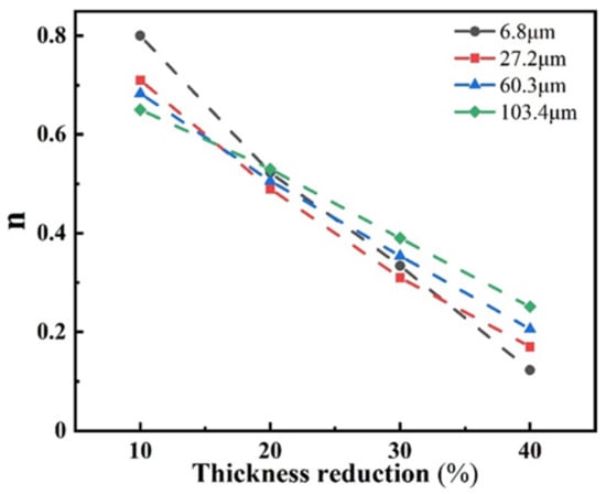 According to the work-hardening index n calculated in Equation (5) of the four groups of samples with different grain sizes, the variation in n values for the samples with different rolling reductions is plotted, as shown in Figure 8. It can be seen that the work-hardening index of the four groups of samples with different grain sizes gradually decreased as the reduction increased. The TWIP effect was lower in the large grain size samples due to the lower dislocation density and less twinning in the sample at a low reduction. The n value of the sample with the average grain size of 6.8 μm was 0.8, while the n value of the sample with the average grain size of 103.4 μm was 0.65. With the increase in the rolling reduction, the internal dislocations of the fine-grain samples proliferated rapidly, which resulted in a rapid decrease in the work-hardening index. The volume fraction of twins in the large grain size sample was higher than that of the small grain size sample at a higher pre-deformation, which promoted the TWIP effect effectively and resulted in the largest work-hardening index of 0.25 for the 103.4 μm grain size sample when the rolling reduction was increased to 40%. However, the work-hardening index of the 6.8 μm grain size sample decreased rapidly to 0.12, which was the lowest among the four groups of samples.